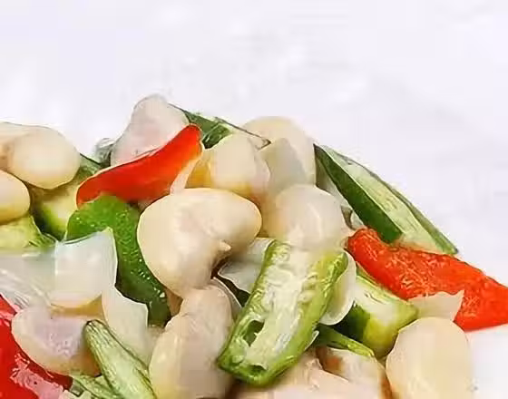 2、熱鍋,倒油,放秋葵、胡蘿蔔、玉米、花生大火翻炒八成熟。