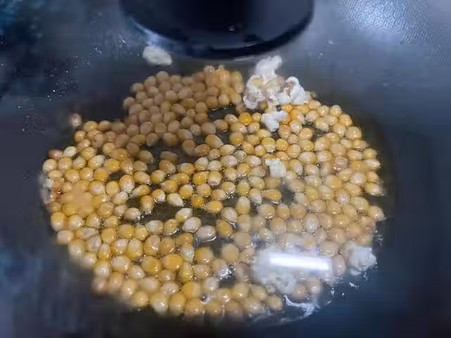 3、轉小火,從鍋里傳出噼噼啪啪的聲音,待聲音基本停止後關火,爆米花就爆好了。倒在篩子裡,散去熱氣。。。