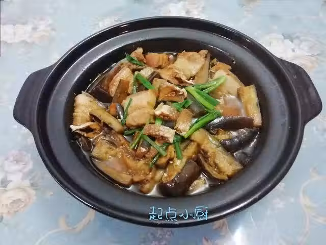 4、接著用炸鹹魚的鍋底油,把茄子也炸一下,撈起來放入砂鍋中,一起再燜10分鐘,出鍋前加入雞精、蔥段和胡椒粉即可。
