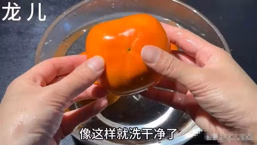泡了五分鐘後,現在我們就可以將柿子用手搓洗干凈了。