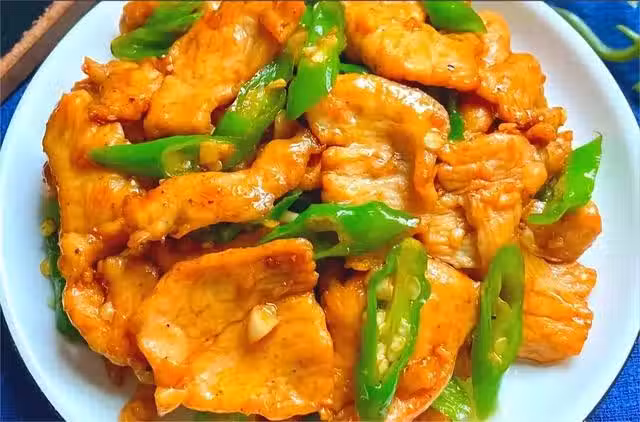 步驟三:鍋中燒油,倒入肉片,滑熟盛出。鍋里留油,再把蔥段、蒜末炒香,倒入炒好的肉片,加一勺生抽、一勺蚝油、倒入青椒碎,翻炒均勻即可出鍋。
