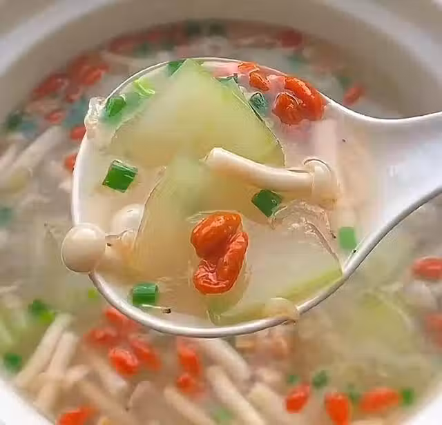 步驟二:鍋中加一點油,加入蔥、姜、蒜炒香,再加一勺蝦皮,炒香,加入開水,加入冬瓜片和白玉菇,大火煮三分鐘,加入幾粒枸杞,撒點蔥花即可出鍋。這鍋湯鮮香十足,營養豐富。冬瓜含水量大,白玉菇富含膳食纖維,這樣一碗湯的熱量很低,晚餐喝上一碗最合適。