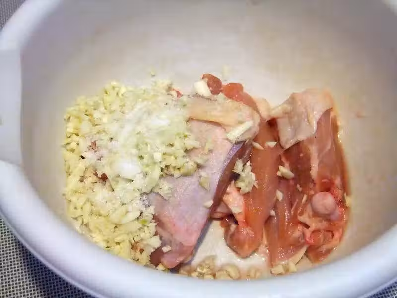 1.把雞肉清理干凈,倒入蒜蓉和1 小勺鹽和一點點黑胡椒粉,拌勻,腌一個小時以上。