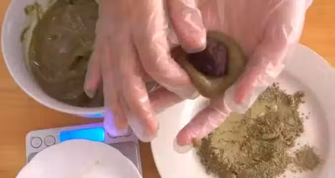 取40克抹茶糯米團,包入16克紅豆沙,用虎口收緊,再蘸上抹茶粉。