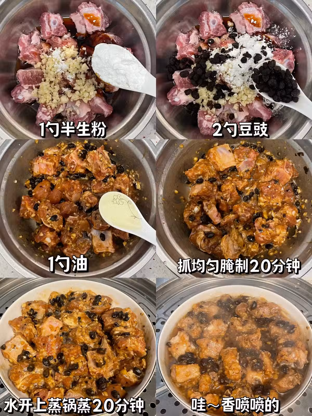 ➕1勺生抽➕1勺蚝油➕少許鹽➕1勺料酒➕2勺蒜末➕1勺半生粉➕2勺豆䜴,抓均勻後➕2勺油再抓均勻,腌制20分鐘