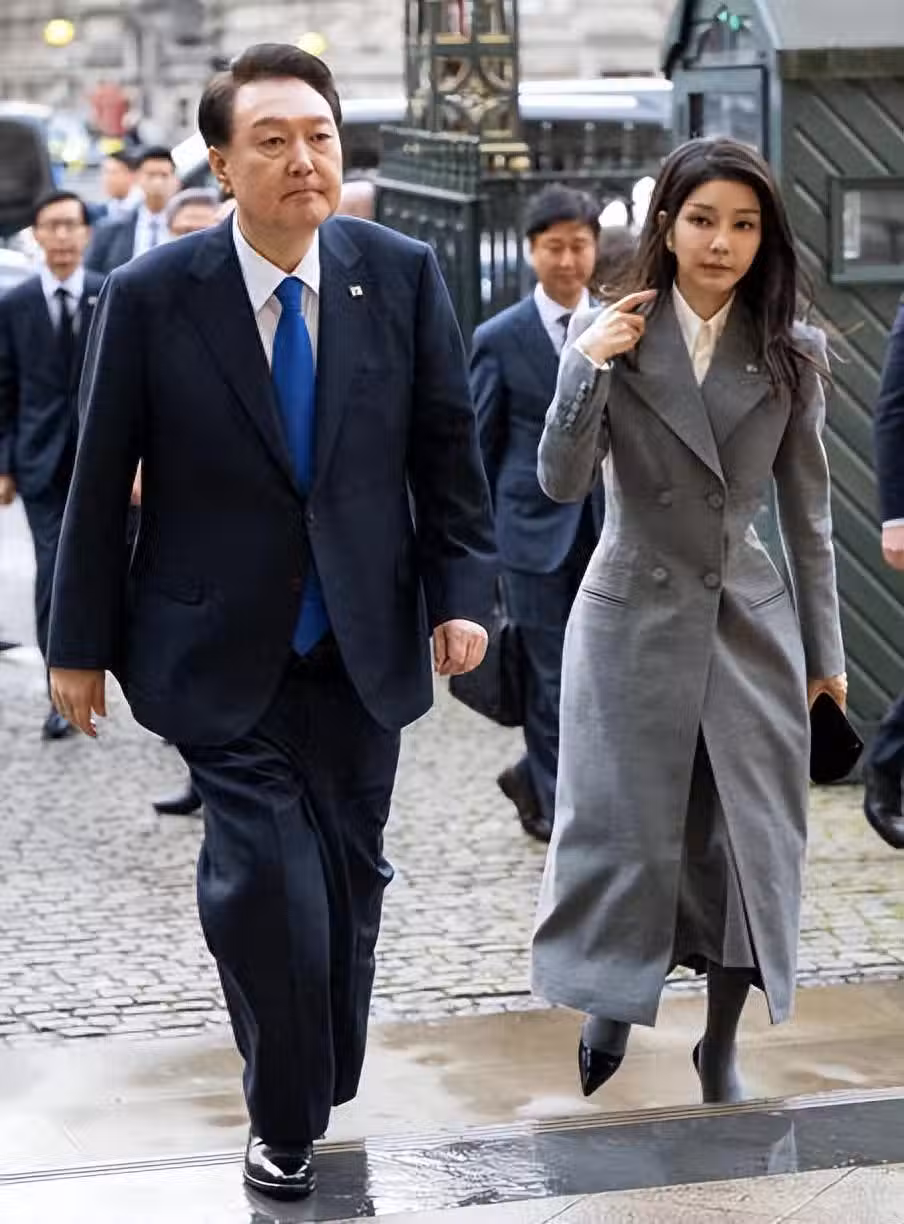 在白天的歡迎儀式上,金建希的灰色大衣內搭白色襯衫,雖然韓國女團風格很火辣,但是金建希每次的造型都還是比較保守,而這次沒想到凱特王妃卻放出了大招,凱特的兩套造型都讓金建希只能自己認輸了。