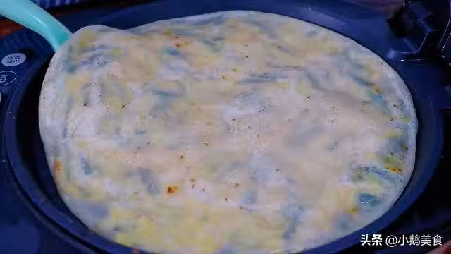 6、翻一下面,蓋上蓋,再大火烙一分鐘左右。烙到下面的雞蛋焦黃,這樣吃起來會更香。火候可以根據家裡的鍋火力進行調整。