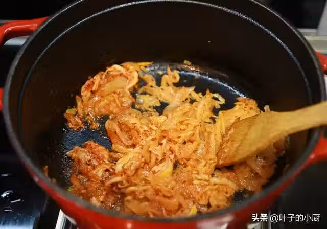 6、加入西紅柿丁翻炒均勻,多炒一會,將西紅柿充分炒成西紅柿汁。