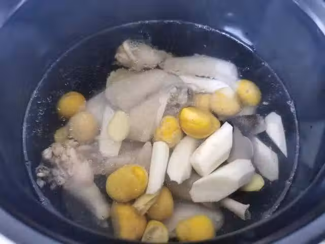 9.在電壓力鍋里放入山藥,板栗和薑片,然後把壓力鍋的蓋子蓋上,開啟熬湯功能,熬個四十分鐘左右就可以了。