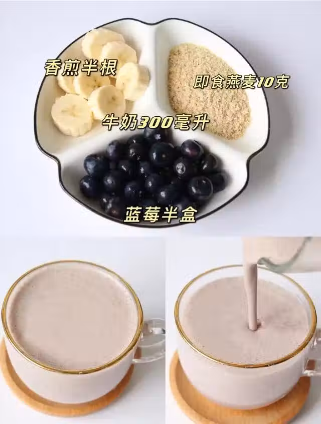 藍莓半盒,香蕉半根,即食燕麥10克,牛奶300毫升