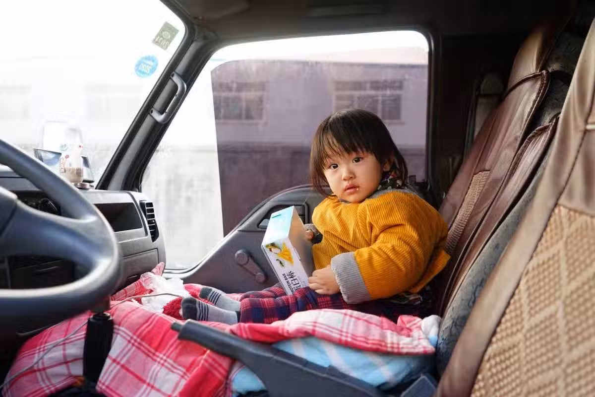 父女倆在卡車駕駛座內嬉鬧的畫面相當溫馨,有時小女孩看到陌生人,