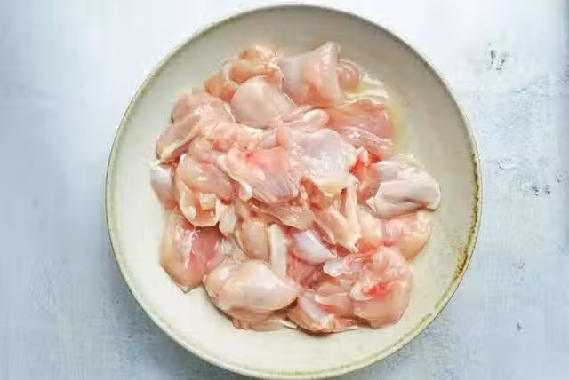 為了吃起來開更加的方便我們把雞肉去一下骨,去骨之後把雞腿肉剁成小塊。