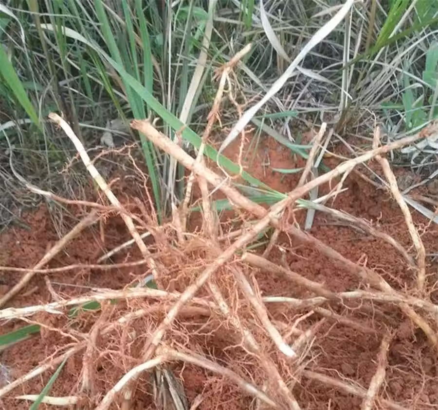 看看我們剛才這樣挖出來的,就是這樣的根,這樣一節一節的粗壯的,雪白的這樣的根,看一下是不是很漂亮,很白,小時候我們經常會這樣挖出來,直接咬著吃,很甜的。因為這種植物的根部,含有大量的蔗糖,所以很甜的。