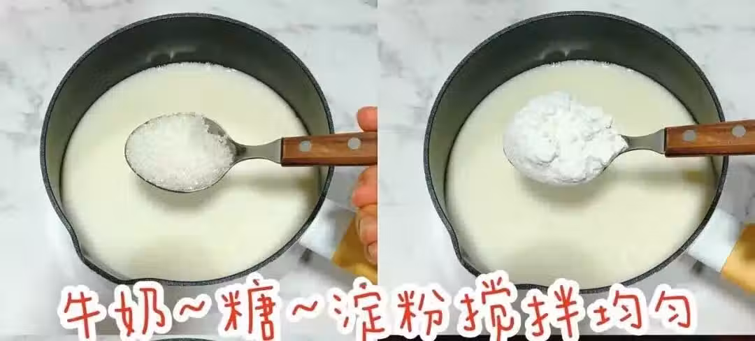 牛奶+白糖+玉米澱粉+蛋黃,倒入鍋中攪拌均勻,再開小火邊煮邊攪拌