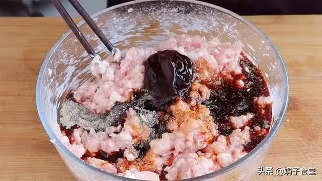 10.調料攪勻後,往肉餡里加入一大勺剛剛炸的料油,再次攪勻。