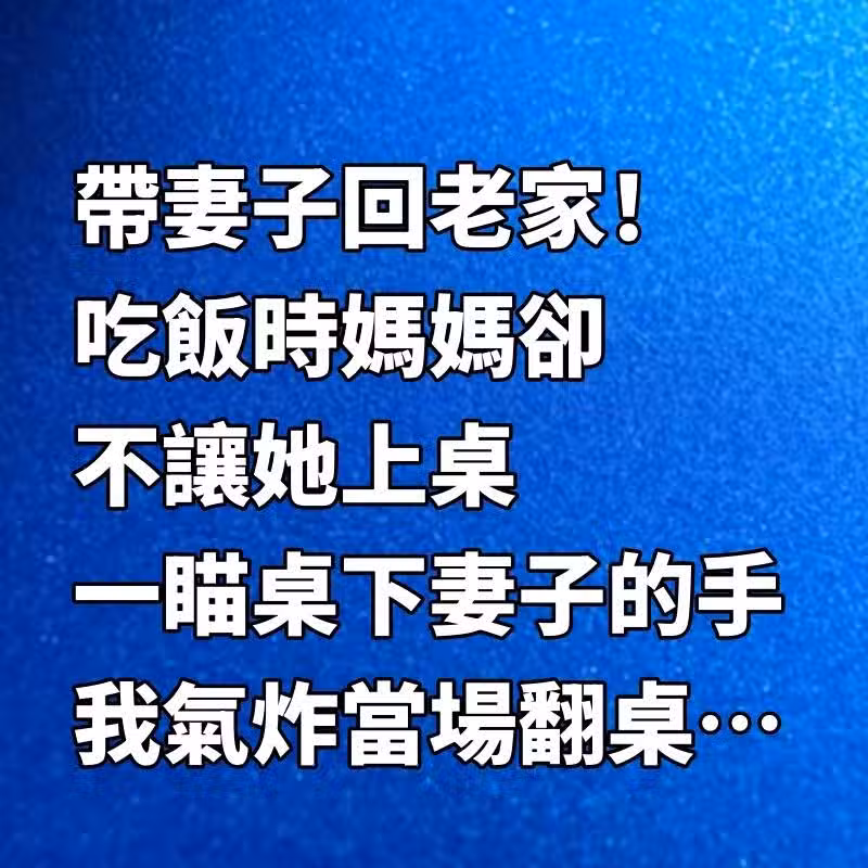 帶妻子回老家!吃飯時媽媽卻「不讓她上桌」,一瞄桌下妻子的手「我氣炸當場翻桌」…