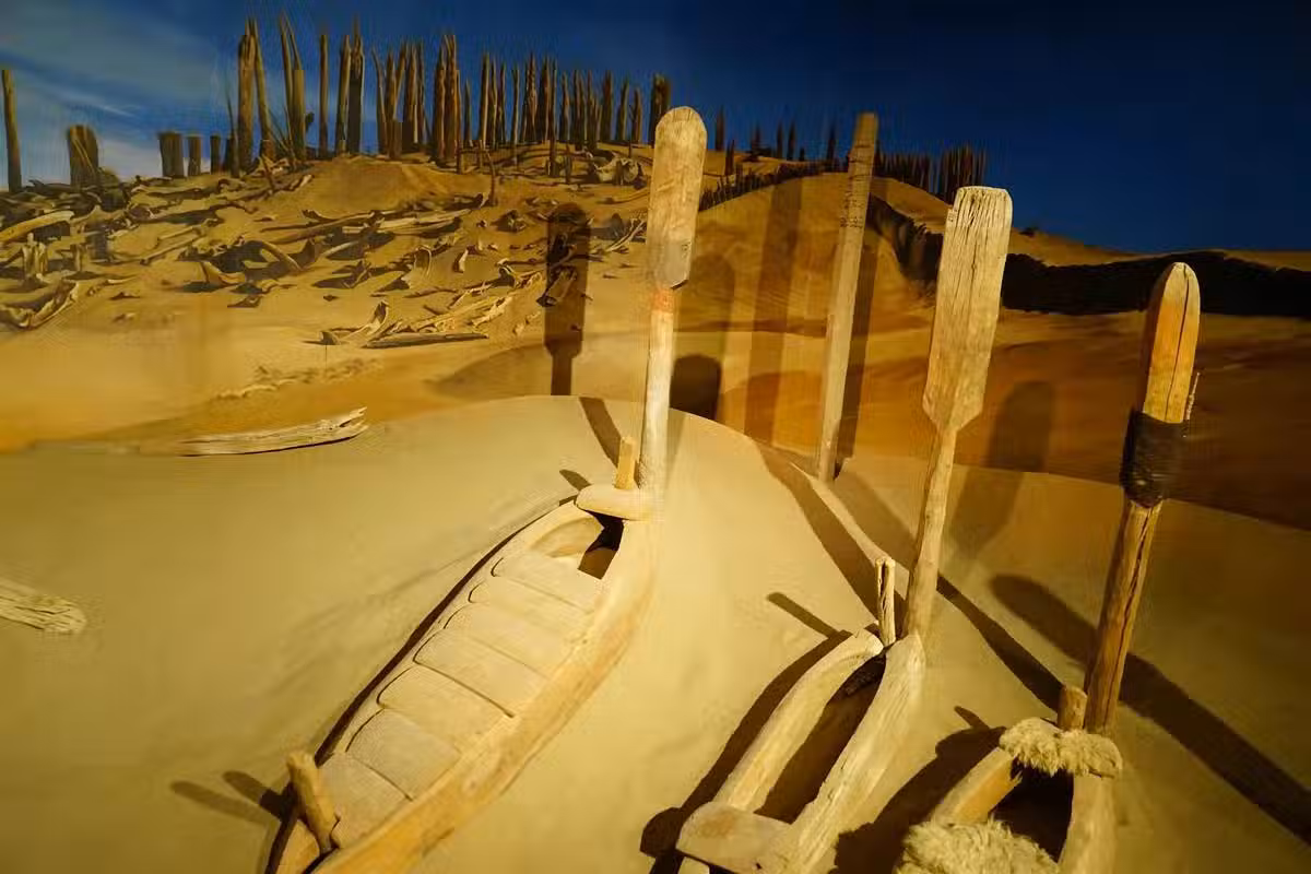 但小河墓地的棺材不止這一種。北區,考古學家們發現了一些不一樣的棺材, 那就是9座泥殼木棺。其中有4座保存完好。