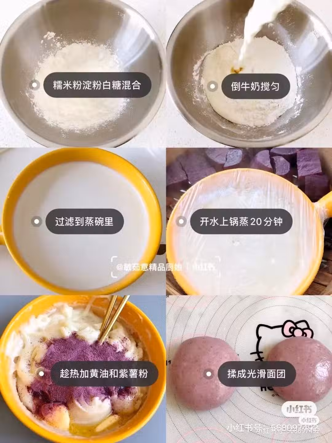 2.】蒸熟後,趁熱黃油紫薯粉,用筷子攪勻,再揉成光滑麵糰備用