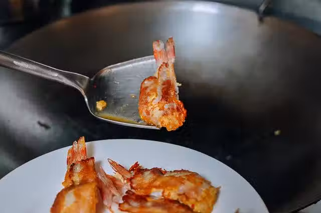 等到把培根煎到呈現金黃色,然後用鍋鏟把蝦鏟起來翻個面,翻面後煎30-60秒,全部煎好之後盛到盤子裡面備用。