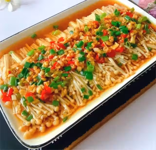 步驟三:將清洗乾淨的金針菇擺入盤子裡,把蒜蓉醬澆在金針菇上,水開上鍋蒸8分鐘,出鍋撒點蔥花即可。