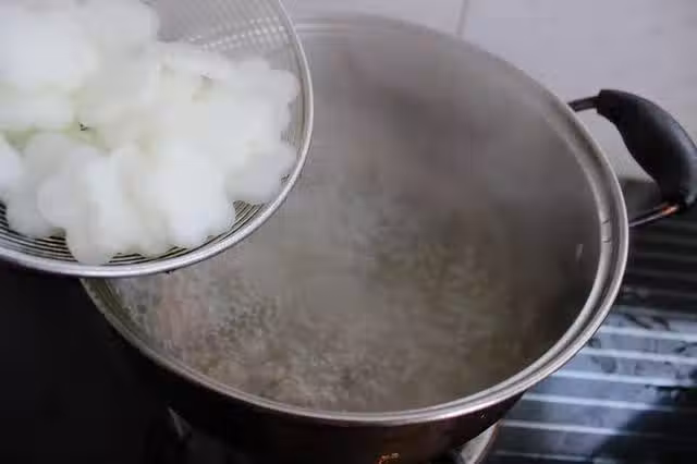 把擠好的羊肉丸子輕輕地放到水裡,用這種方法做好所有的丸子,肉丸煮熟之後撈出,另起一鍋熱水下入丸子,煮幾分鐘之後再下入切好的冬瓜片,冬瓜熟了之後把粉絲放進去,最後放入雞精,胡椒粉和適量的鹽調味。