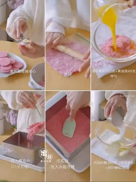 奧利奧去掉夾心,然後擀碎,加入融化的黃油拌勻,倒入模具裡面,壓實之後送入冰箱冷藏。