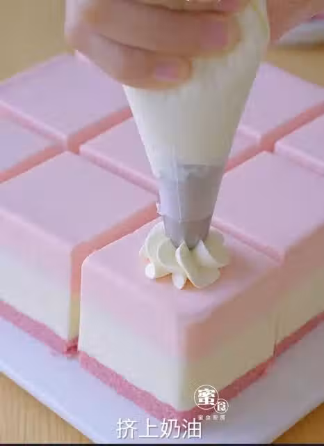 完成凝固之後就可以脫模了,然後切成小方塊,放上粉色的奧利奧。