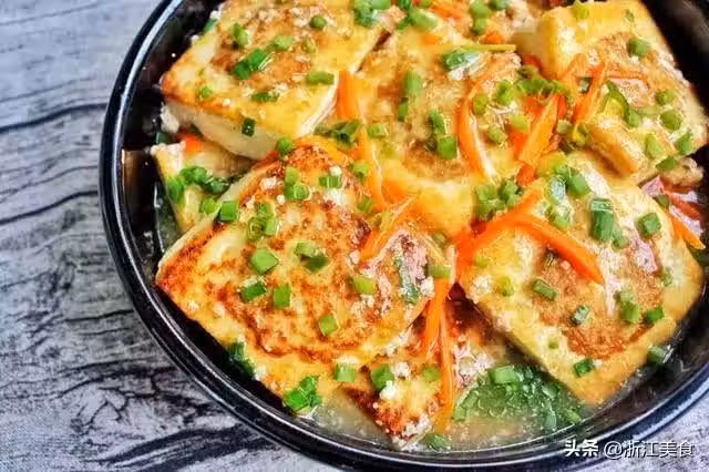 豆腐和肉熟後加入蔥花,豆腐盛起