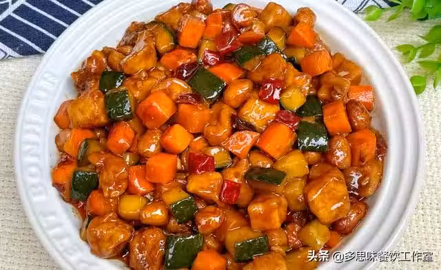3鍋中熱油倒入雞胸肉炒至變色盛出,加入蒜末辣椒炒出香味,加入一勺豆瓣醬炒出紅油,加入胡蘿蔔黃瓜丁翻炒兩分鐘
