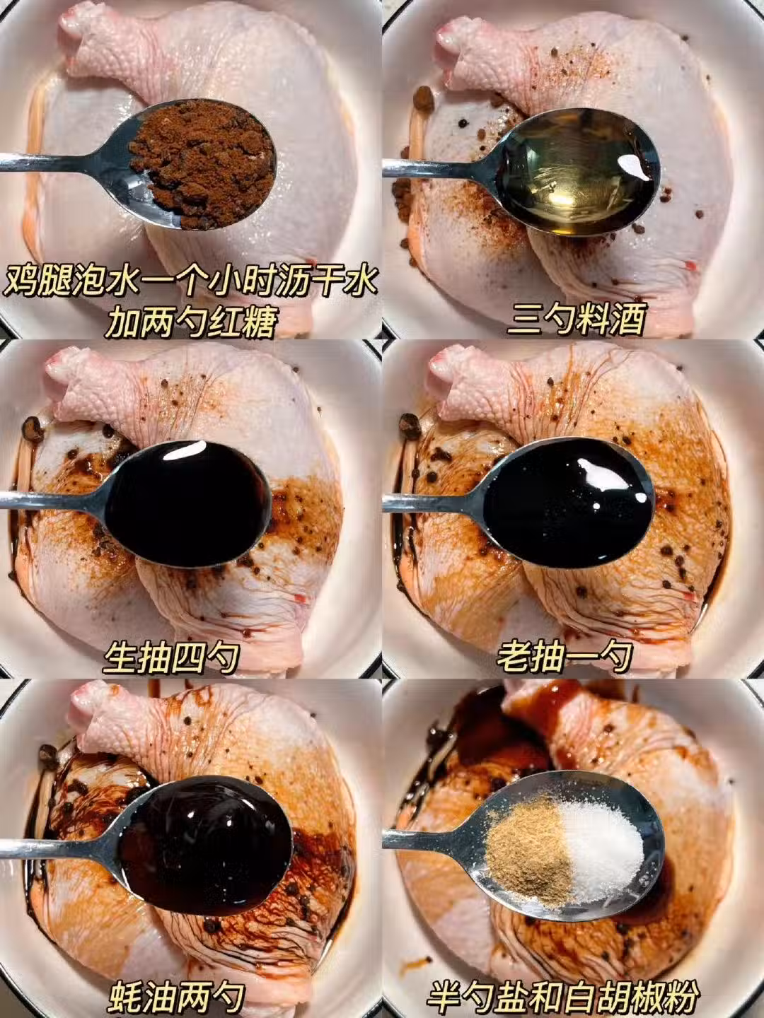 1️⃣雞腿泡水一個小時瀝干水加兩勺紅糖,三勺料酒,四勺生抽,一勺老抽,兩勺蚝油,半勺鹽和白鬍椒粉,抓拌均勻腌制40分鐘。