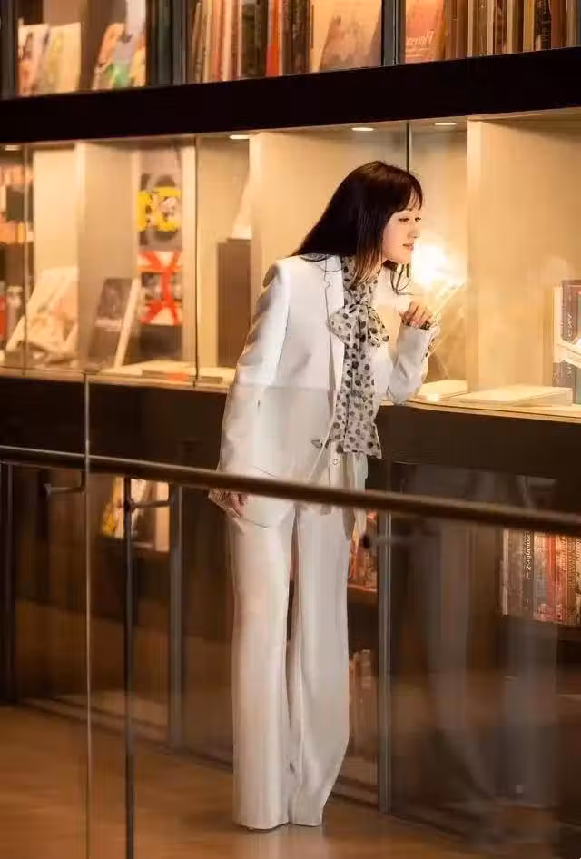 同樣是一身白色系服裝,將頭髮燙卷的楊鈺瑩,戴上了一頂格子圖案的貝雷帽,看上去非常的時尚而且洋氣。上身白色襯衫,搭配下身的白色鉛筆褲,腳上再踩著一雙白色皮質高跟短靴,整體穿搭造型看起來簡單又干練,這樣的穿搭可以說是非常適合職場女性了。