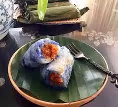 1. 糯米泡4小時,糯米上鋪上斑斕葉,用椰漿兌水蒸一會倒入蝶豆花水繼續蒸熟