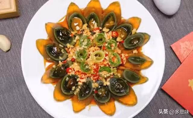 1、皮蛋去殼切成四瓣;將黃瓜削成薄片,捲成小卷,放在盤子的正中間;