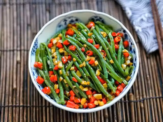 材料:豆角1把、小米辣8個、大蒜粒15克、生抽1勺、香醋1勺、蚝油半勺、鹽適量、食用油25克