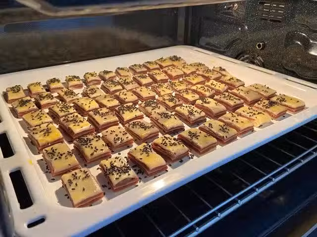 3、如果你烤好的豆沙酥,晾涼後吃起來有點濕,不夠酥,那麼則是沒烤透,此時只需要放回烤箱,用低溫145度上下火,再烤幾分鐘即可。