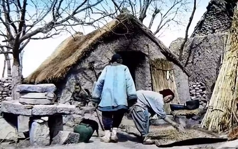 晚清農村景象,茅草屋和土房子,那種年代能穿上好衣服就不錯。我小時候也住過茅草房。76年才蓋紅磚瓦房。苦難的年代,其實解決溫飽也沒多少年,珍惜現在的生活