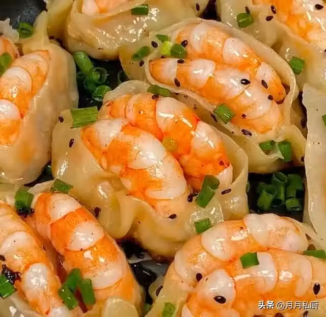3.餃子皮先放肉餡,上面放一隻蝦,把餃子皮四個方向捏出四個角,把兩個角並一起捏緊(如上圖)