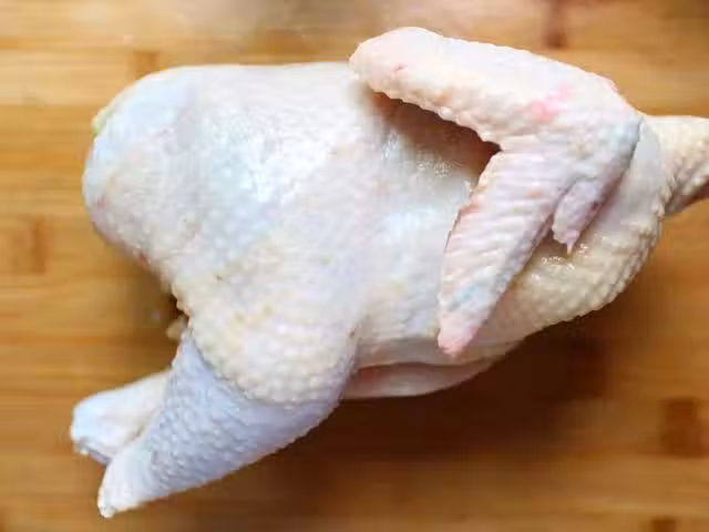 2、接著我們把20克的鹽焗雞粉抹在雞的全身,里里外外都要抹上,抹勻後,在撒適量的黑胡椒粉在雞的表面。