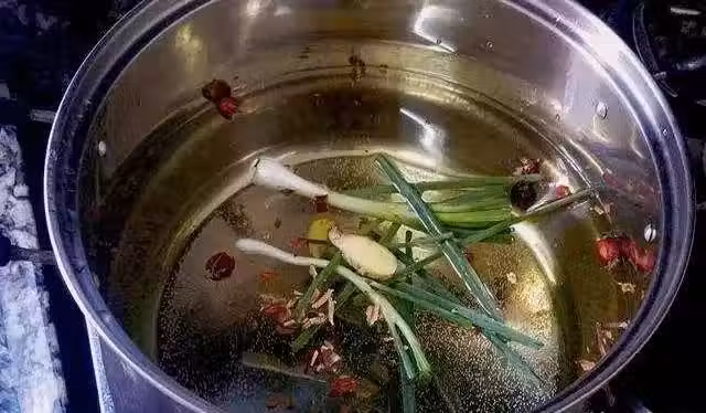 2、鍋中加足量的水,鍋內膽大一些最好,以能沒過整隻雞為佳;鍋中放些八角、蔥段、薑片,大火燒至水開;