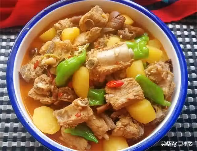 1、燉好的紅菇排骨,湯喝了,排骨,紅菇拿來燉土豆,這樣更入味兒。