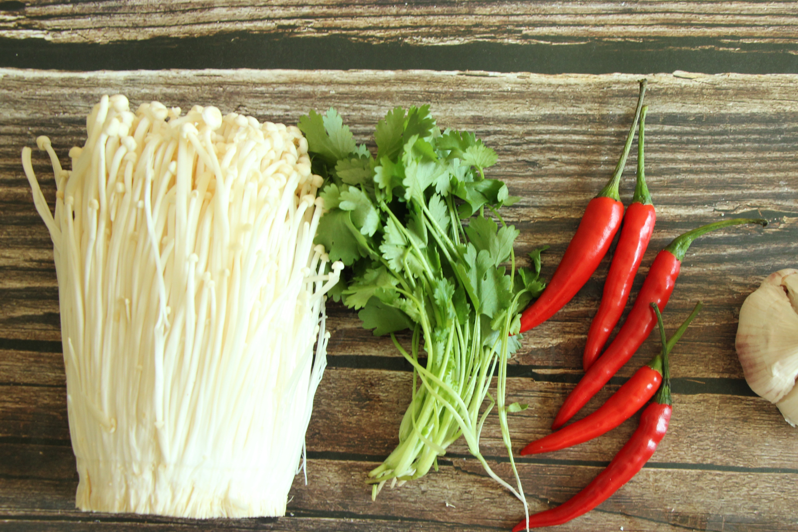 金針菇1捆,大蒜1頭,香菜適量,小米椒適量,生抽2勺,蚝油2勺4,玉米油適量