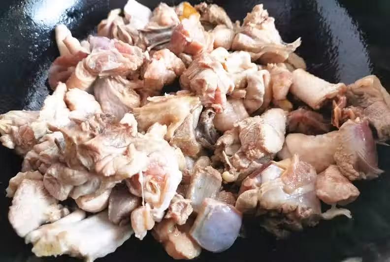 接著炒鍋洗凈燒熱,加少許食用油,放入生薑炒香,再放入雞塊翻炒,多次翻炒後加入足量熱水。