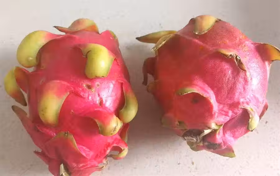 這2個火龍果,1個是白心的一個是紅心的,外皮很接近吧