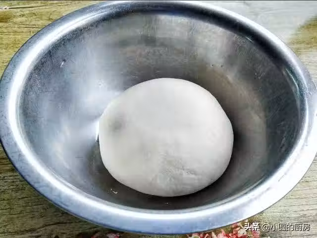 步驟五:麵糰鬆弛好後,把它放在案板上,稍微的揉一下後,搓成長條,分成十等份,撒上少許乾粉防止粘連,用手按壓扁,記得蓋上保鮮膜防止風乾喲!
