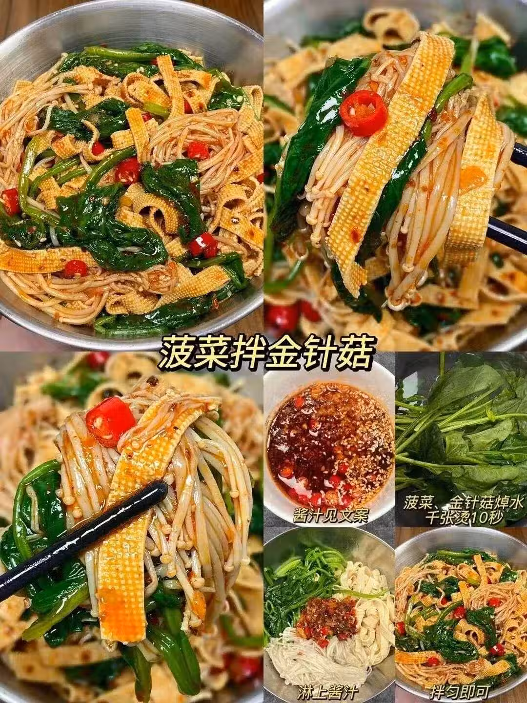 主料:菠菜、金針菇。配料:醬汁、千張。