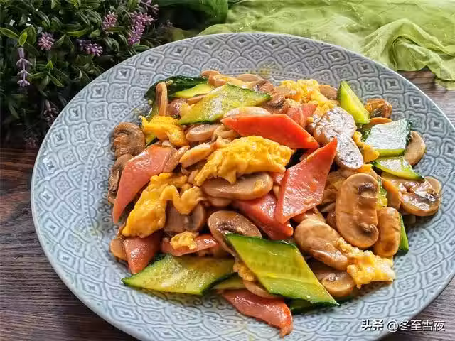 【口蘑炒雞蛋】所需材料:口蘑半斤、雞蛋2個、黃瓜半根、火腿腸1根、油鹽適量、蔥1段、姜2片、大蒜2瓣、蚝油1湯匙、雞精1茶匙、