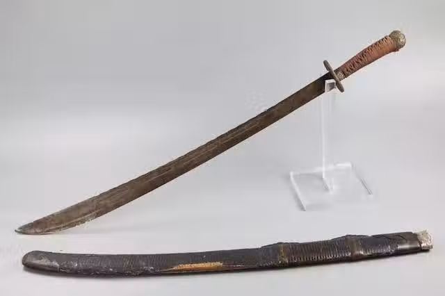 有點類似於我們在電視劇里看到的,抗戰時期所用的大刀,這把雞冠大刀有97厘米長,其重量大概在三斤,刀身較寬,製作工藝也比較簡陋。