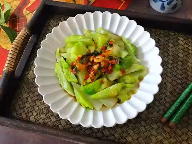 3、把瀝干水分的兒菜碼入盤中,把料汁澆在兒菜上,拌勻即可。