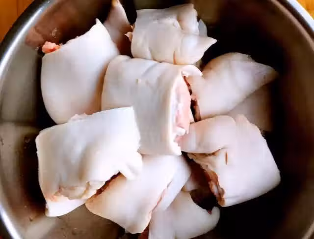 製作過程:第一步,豬蹄一隻,剁塊,冷水下鍋,加上蔥段和生薑片,放入一勺料酒,大火將鍋燒開,撇去浮沫,撈出豬蹄,用溫水沖洗乾淨,控水;