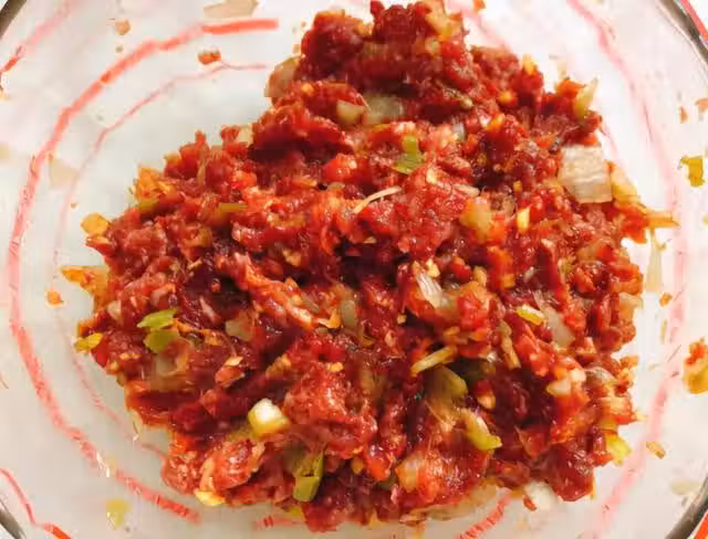第二步,先拌牛肉餡,在牛肉末中加上花椒粉、食鹽、生抽和蚝油,順時針攪拌均勻,讓牛肉餡上勁,再將切碎的茼蒿和蔥花也一同放入;